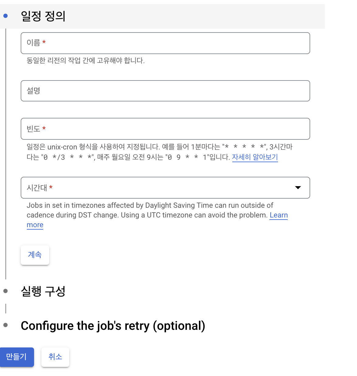 작업의 이름과, 시간대를 설정할 수 있다.